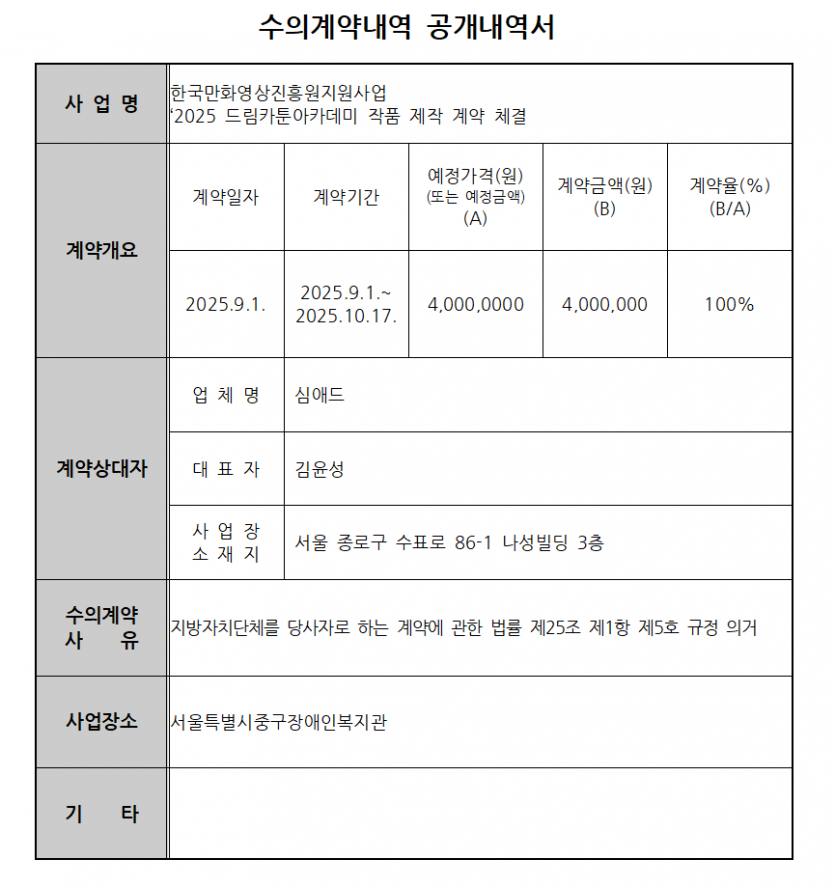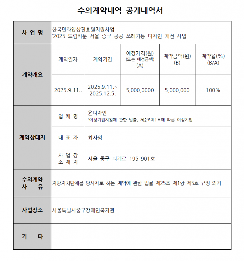 2025년도 3분기 서울중구장애인복지관 수의계약 내역을 공개합니다.