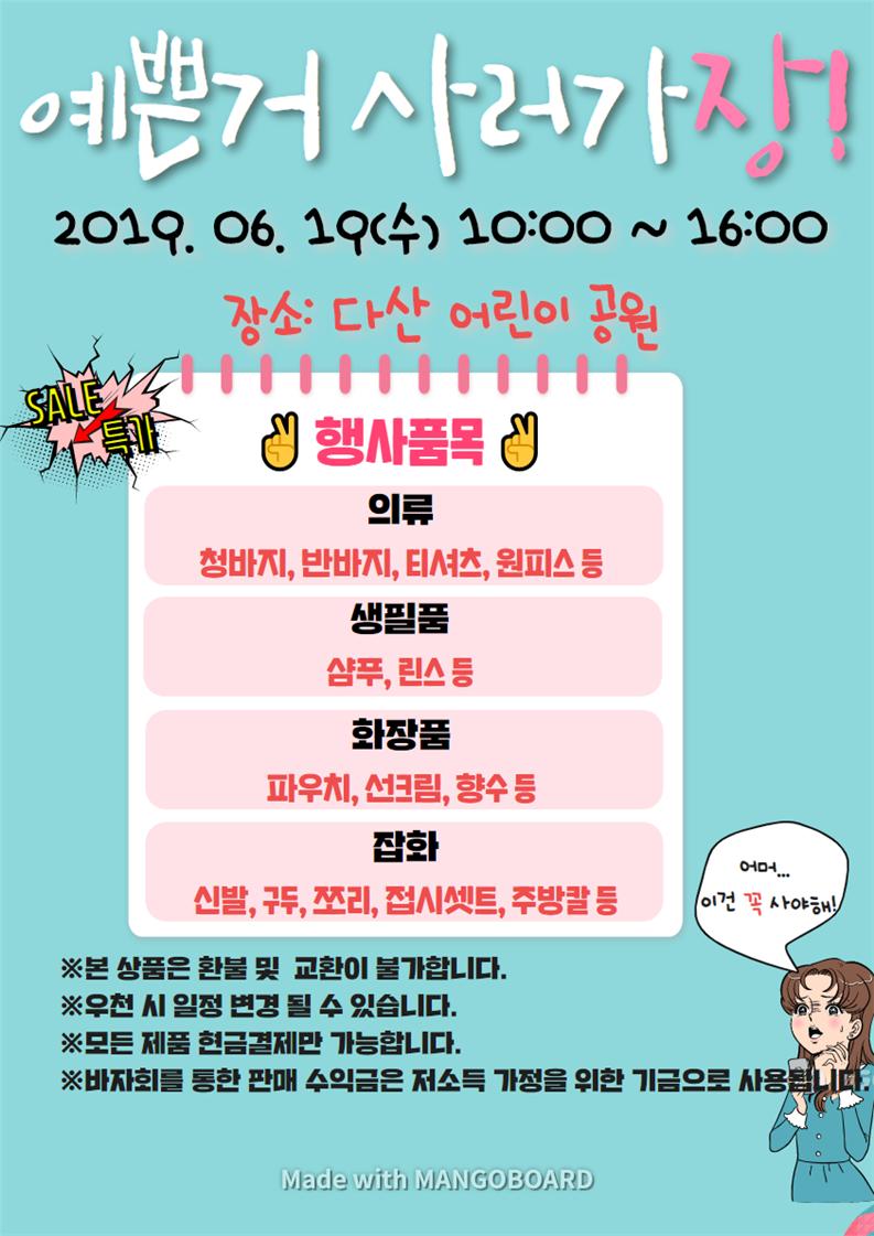예쁜옷과 화장품, 샴푸, 린스 등 다양한 물품을 판매할 예정이니 지역주민여러분의 많은 관심과 참여부탁드립니다.