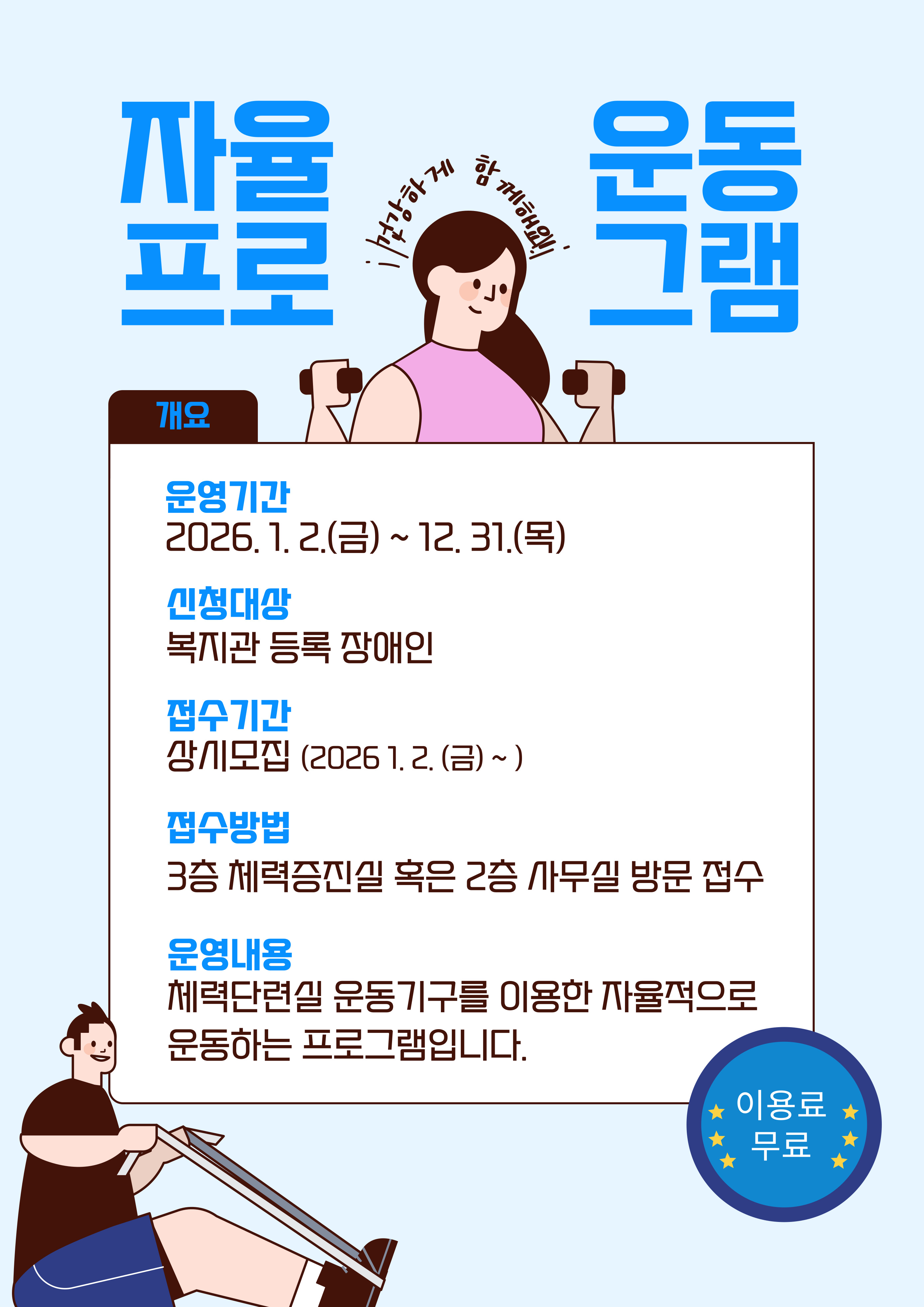 3층 체력증진실 혹은 2층 사무실에서 신청서 작성 후 이용이 가능합니다.