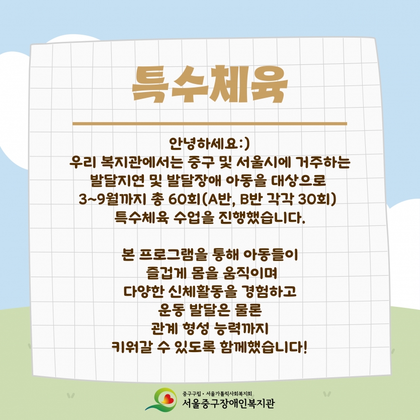 우리 복지관에서는 3~9월까지 중구 및 서울시에 거주하는 발달지연 및 장애아동들에게