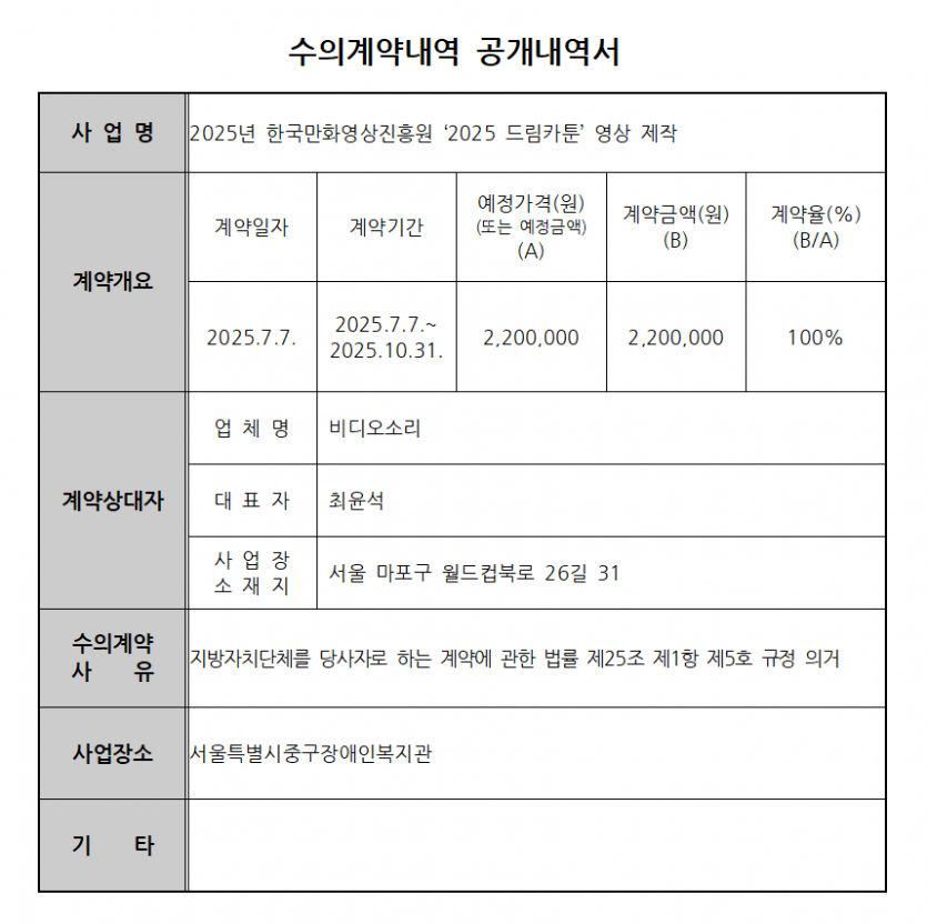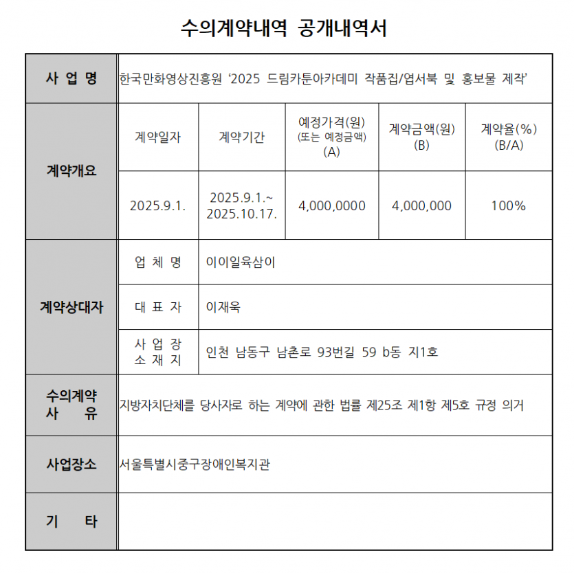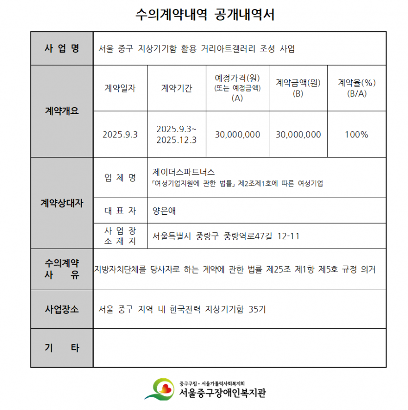 2025년도 3분기 서울중구장애인복지관 수의계약 내역을 공개합니다.