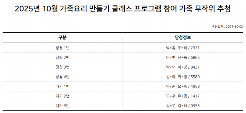 2025년 10월 패밀리 셰프단(홈베이킹 클래스) 프로그램 참여가족 추첨 결과를 안내드립니다.
