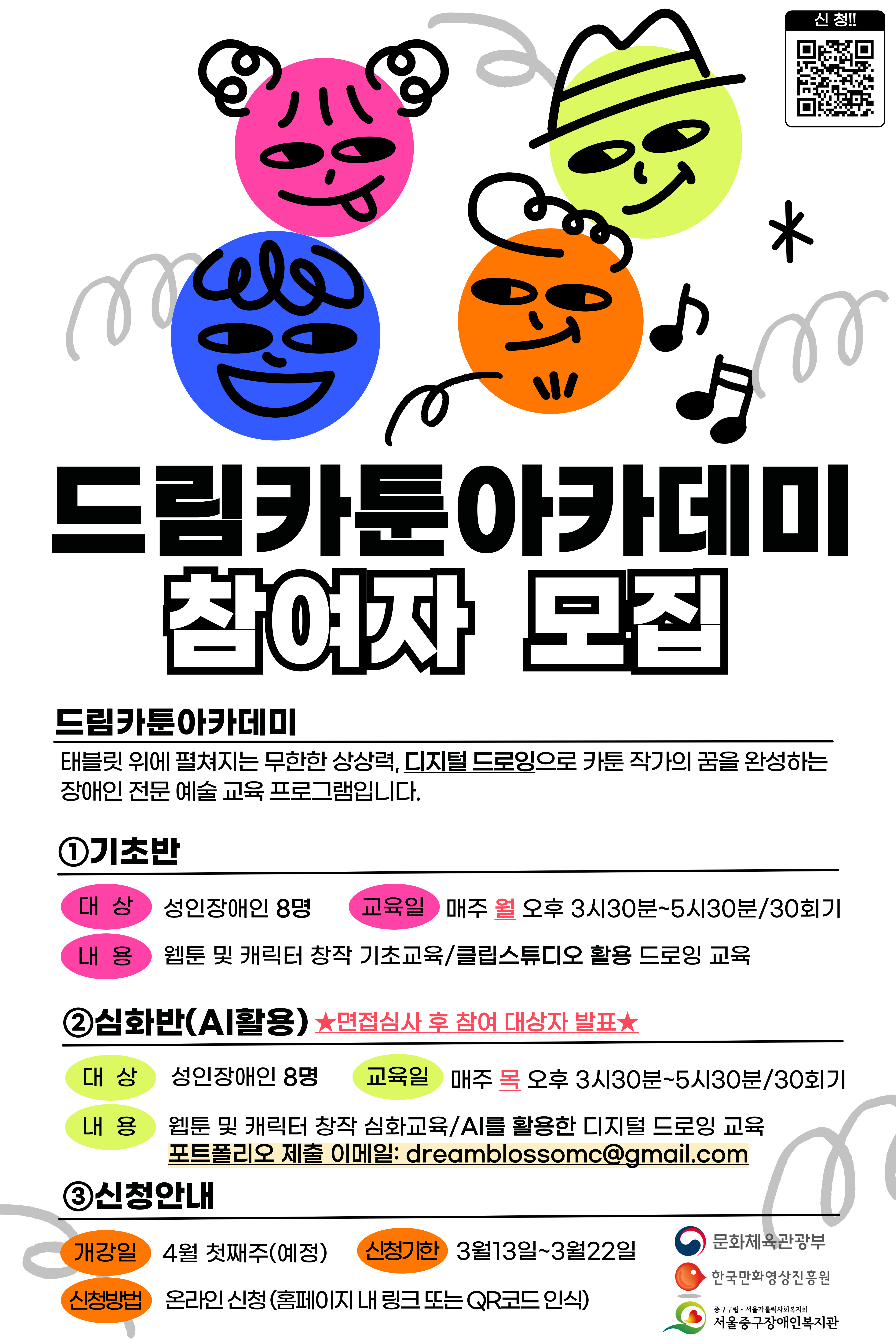 드림카툰아카데미는 태블릿 위에 펼쳐지는 무한한 상상력, 디지털 드로잉으로 카툰 작가의 꿈을 완성하는 장애인 전문 예술 교육 프로그램입니다. 관련해서 2026년 드림카툰아카데미 참여자를 모집하오니 많은 관심과 참여를 부탁드립니다.