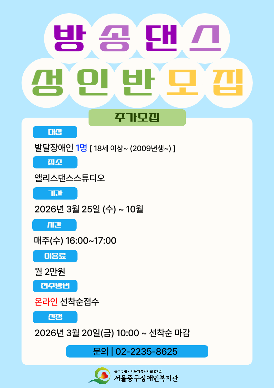 2026년 방송댄스(성인) 프로그램 참여자를 아래와 같이 추가 모집하오니 많은 관심과 참여 부탁드립니다!